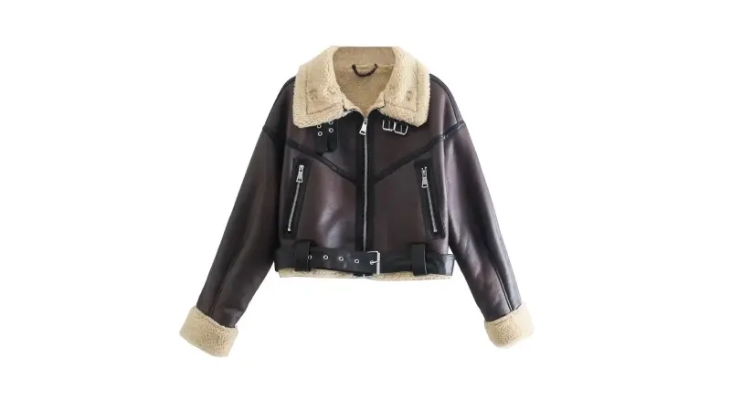 TRAF Winter Women Streetwear Faux Lamb Leather Fur Short Jacket with Belt Moto Biker Thick Warm Sheepskin Coat Outwear